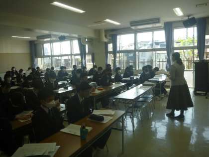3年生は視聴覚室で、まずは感染症予防の話を保健だよりを見ながら。