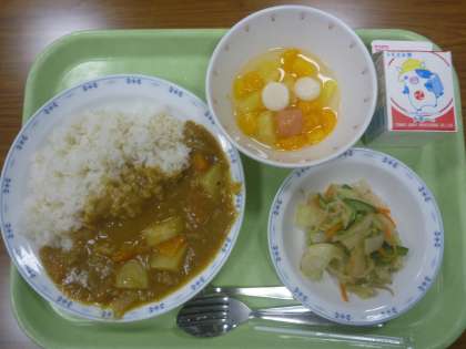 チキンカレーライス・こんにゃくサラダ・紅白白玉ポンチ・牛乳です。