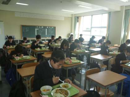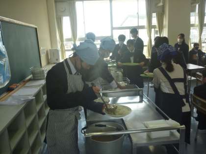 給食当番が配膳をし、1時10分やっといただきますになりました。今年も分散給食です。