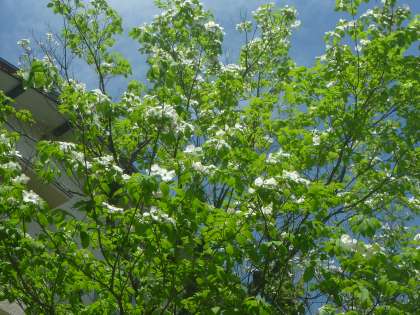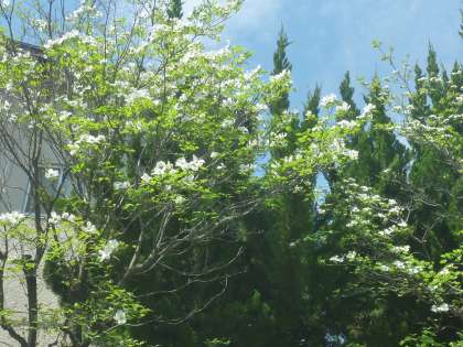 校舎裏の桜が葉桜になり、ぽかぽかの今日は、ハナミズキが綺麗な白い花を咲かせ始め、その下ではつつじが数輪花を開き始めました。春ですね〜