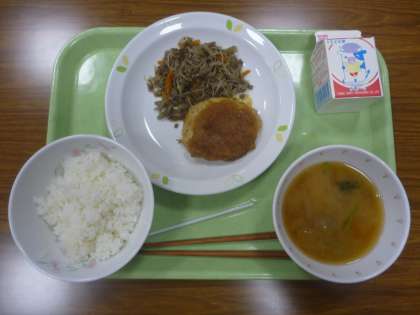 ご飯・みそ汁・和風ハンバーグ・白滝のきんぴら・牛乳です。