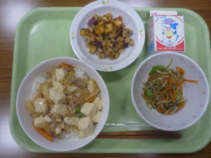 豆腐のうま煮丼・お豆かりんとう・磯和え・牛乳です。