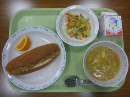 大豆ミートサンド・卵と野菜のスープ・ハニーサラダ・清見オレンジ・牛乳です。