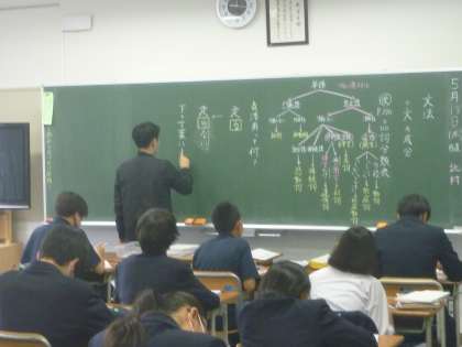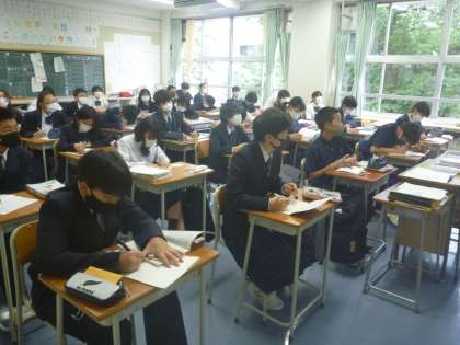 「文法の活用表」の説明を真剣に聞いています。 今日は、テスト6日前です。