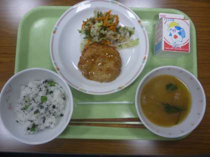 わかめ入りピースご飯・みそ汁・松風焼き・野菜のゆかり和え・牛乳です。