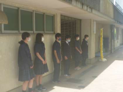 今朝は、晴天のもとあいさつ運動を美化委員と生徒会役員が正門と昇降口に分かれて、元気よく「おはようございます」と声かけをして、今日1日スタートです。