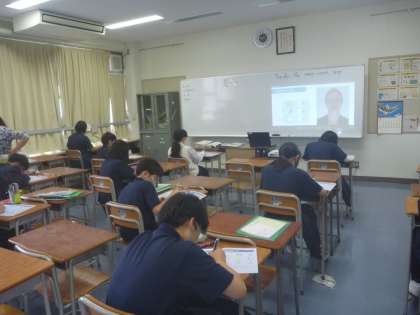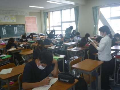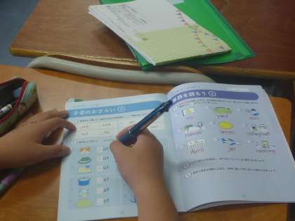 BINGOの後、デジタル教科書の外国人の先生の発音を聞いて、子音を聞き取って、問題集の「子音のおさらい」に記入しています。