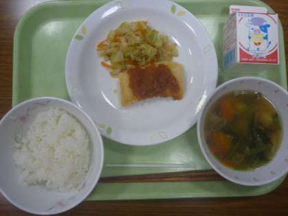 ご飯・豆腐団子スープ・いかのチリソース・野菜の中華味・牛乳です。