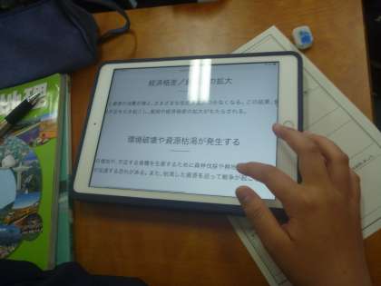 「人口が増えるとどのような影響が出るか?」という質問に対してタブレットを使い、グループごとに、Teamsで各自が検索した意見をまとめています。