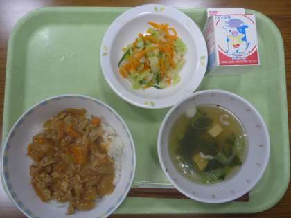 豚肉の甘みそ丼・すまし汁・野菜の即席漬け・牛乳です。