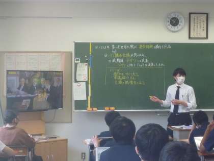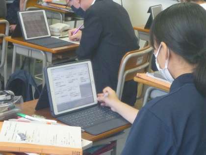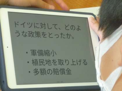 「第1次世界大戦と日本」の単元で、まずロイロノートを各自のタブレットで開いて、今日は、ベルサイユ条約と国際連盟の特色について。戦後政策を論理的に考察し、ロイロノートに自分の意見を書き、グループで意見を出し合い、考えを深めています。