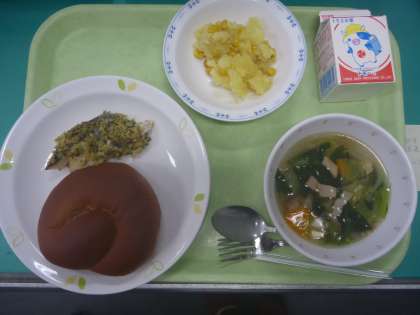 ココアパン・ベーコンと野菜のスープ・魚のハーブパン粉焼き・バターコーンポテト・牛乳です。