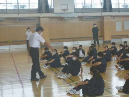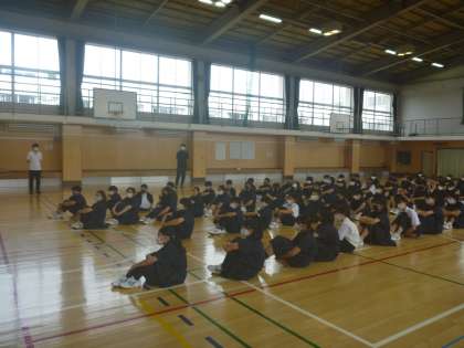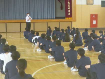 1年生は、全校朝会・生徒朝会のない月曜日、体育館で学年朝会を行っています。