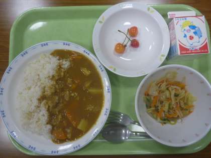 チキンカレーライス・こんにゃくサラダ・さくらんぼ・牛乳です。
