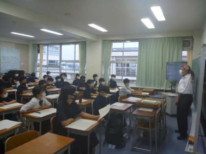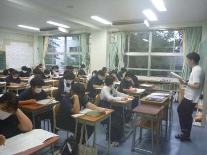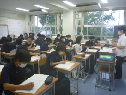 昨日終わった期末テストが返却され、先生の解説をみんな真剣に聞いています。