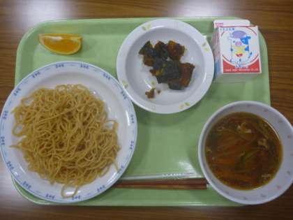 中華つけ麺(みそ味)大学かぼちゃ・バレンシアオレンジ・牛乳です。
