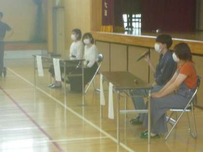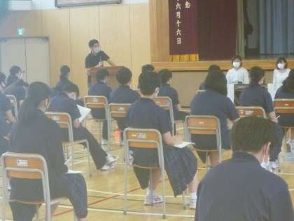6時間目、体育館で、夏休みを前に卒業生から高校・大学受験や勉強法について話を聞くことで、高校見学や夏休みの勉強について考える機会を作るを目的に、4人の卒業生が都立・私立高校の様々な話をしてくれています。