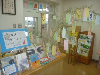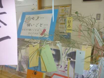 図書室の笹には、沢山の短冊が。みんなの願いが叶いますように。今晩晴れますように!