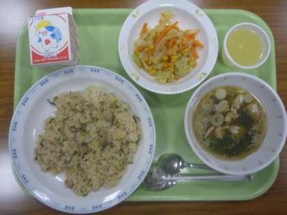 高菜チャーハン ・豆腐団子スープ ・コーンサラダ ・りんごゼリー ・牛乳です。