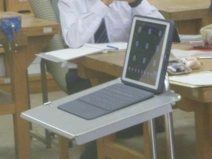 先生の机の前に、オンライン用のiPadのカメラが設置され、ICT支援員の方も、何かオンラインでトラブルがあったときに、すぐに対応出来るように、居て下さっています。