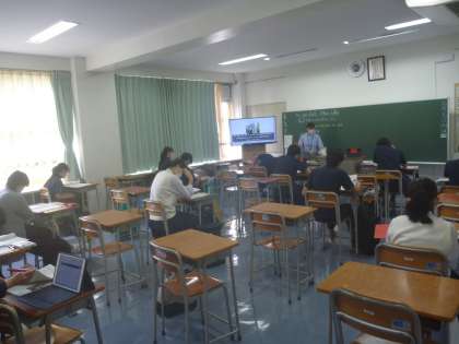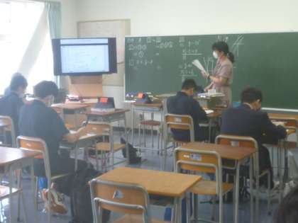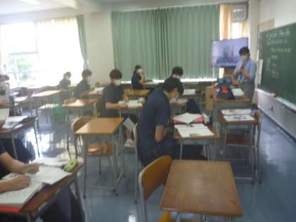 今日も授業をする先生と、後ろでは、家でオンライン授業を受けている生徒と同じ画面をiPadで見て、上手く配信されているか確認している先生の2人で、授業を行っています。