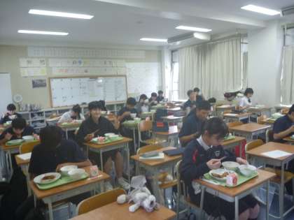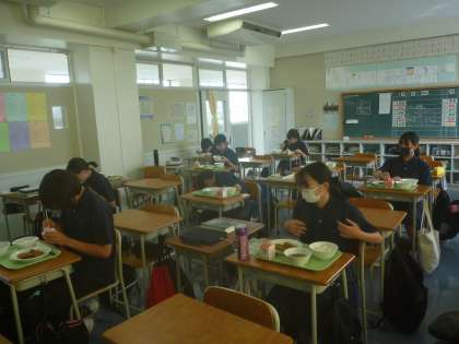 今日からも、1クラスを2つの教室に分けて、分散給食です。