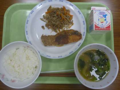 ご飯 ・みそ汁 ・鮭フライ ・白滝のきんぴら ・牛乳 です。