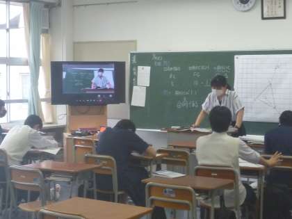 オンラインで受けている生徒にもよく見えるように、iPadの位置などを先生が調整しながら、授業を行っています。