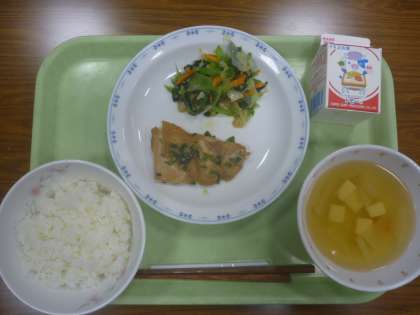 ご飯 ・すまし汁 ・鶏のかわり焼き ・青菜とじゃこの生姜醤油 ・牛乳 です。