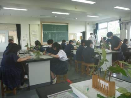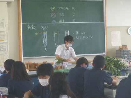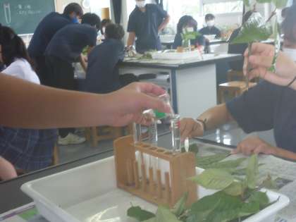 葉っぱの1つは、表にワセリンを塗り、1つは裏にワセリンを塗り、1つはそのままを試験管に水を入れ、表面に油を垂らして膜を作り、試験管にそれぞれ3種類の葉っぱの枝を入れて、どうなるか。