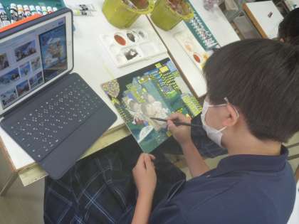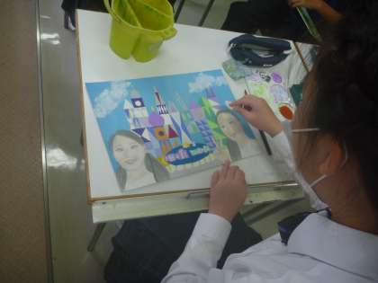 将来、行ってみたい場所に自分がいるイメージの絵を描いています。