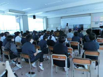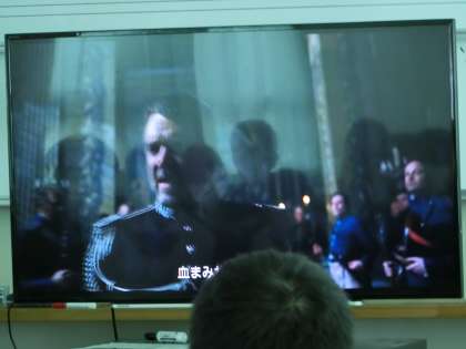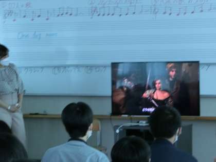 「レ・ミゼラブル」のミュージカルのビデオを鑑賞しながら、それぞれの場面の歌の感想をプリントに記入しています。