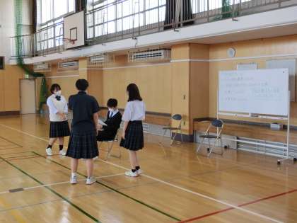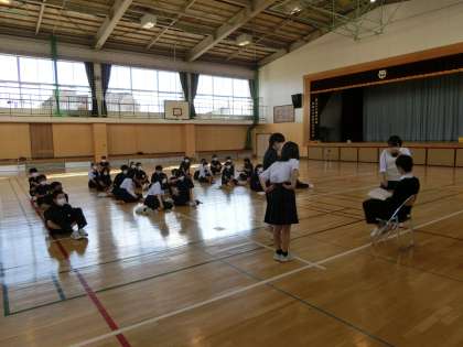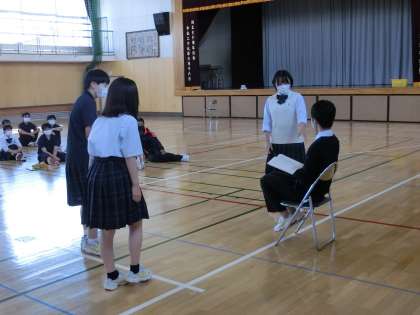 今日は、「演技」で、4人1組になって、2分間前に出て、椅子に座っている人を立たせるために、身振り手振りと、色々な声かけをしています。