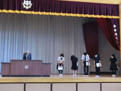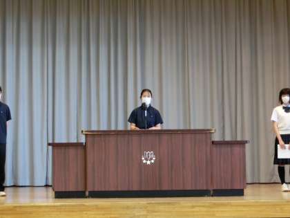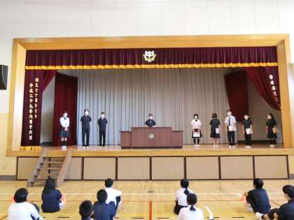 全校朝会の後、引き続き、新しい生徒会役員の認証式を行いました。