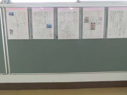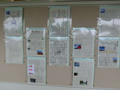 1年生の廊下の壁には、27日に行く河口湖校外学習のために夏休みの宿題で作った新聞が掲示されています。