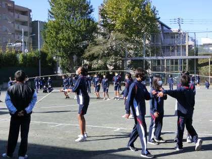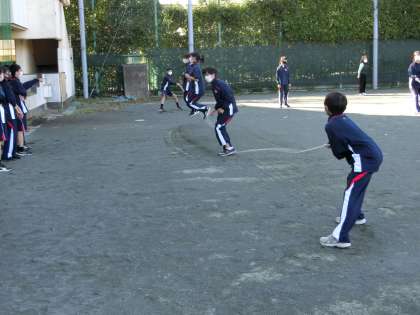 ラジオ体操の後、半分に分かれて、大繩とバトンパスの練習をしています。