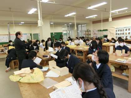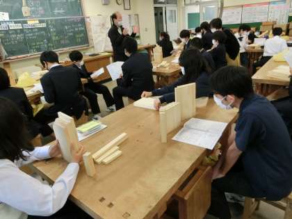 本箱やCDラックの作成の説明を受けています。 今日は、くぎを打つところなどに点を打ちます。 出来上がりが楽しみです。
