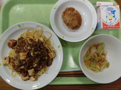 麻婆焼きそば ・さつま芋のもっちり揚げ ・野菜の中華味 ・牛乳です。