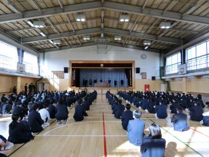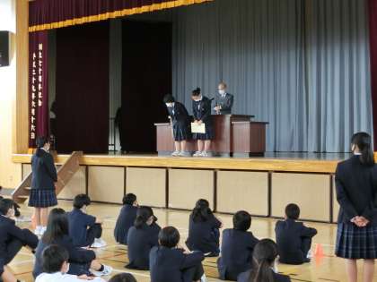 後期の新しい委員長が初めて、生徒朝会で各委員会からの報告をしました。