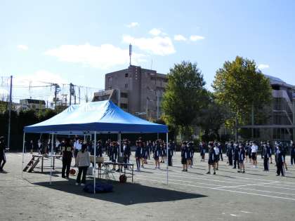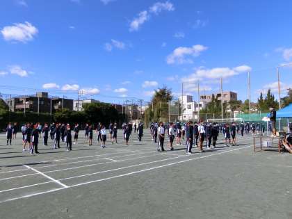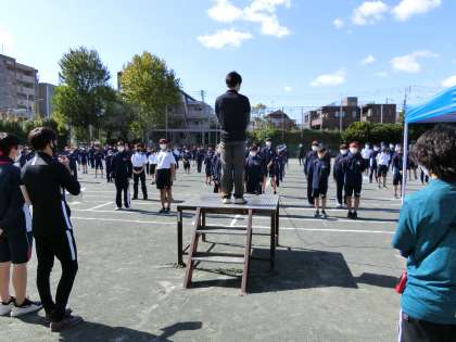 朝は雨だったので、3時間目まで授業を行い、4時間目校庭で、まずは開会式・閉会式の予行を行っています。