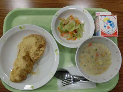 きな粉揚げパン ・コーンシチュー ・フレンチサラダ ・牛乳です