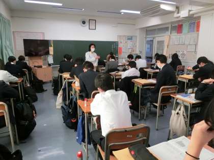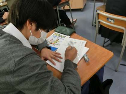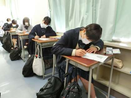 「資料を見て、小論文を書く」を真剣に取り組んでいます。数名の保護者の方も、参観にいらしてます。