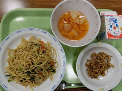 塩焼きそば ・揚げごぼうのごま和え ・フルーツポンチ ・牛乳です。