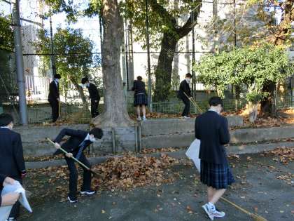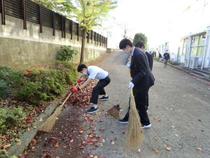 朝7時50分から、生徒会主催の「落ち葉掃きボランテイア」を行いました。