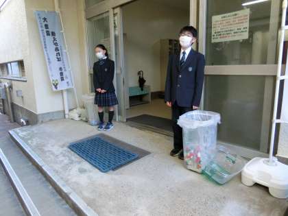 生徒会が今日・明日の朝8時10分から、玄関でエコキャップの回収をしています。