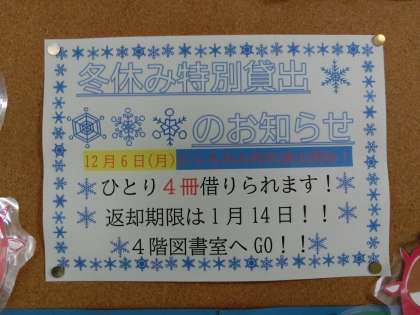 今日から、冬休みの貸出し4冊までが、始まりました。