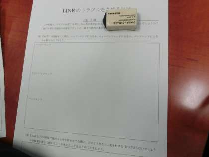 「LINEのトラブルをさけるには」について、ある学校での話し合いのビデオを見ながら、意見を書きだしています。
