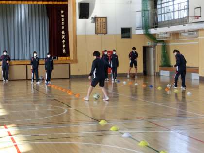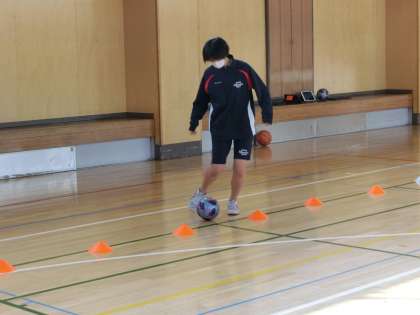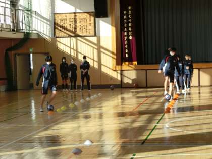 サッカーのドリブルの練習をしています。なかなか難しいようです。
