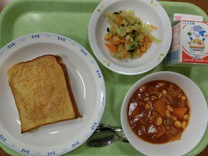 きな粉豆乳トースト ・ポークビーンズ ・キャベツとコーンのサラダ ・牛乳です。