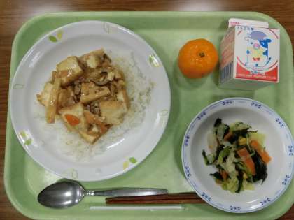 生揚げの家常豆腐丼 ・ねぎだれ中華サラダ ・みかん・牛乳です。